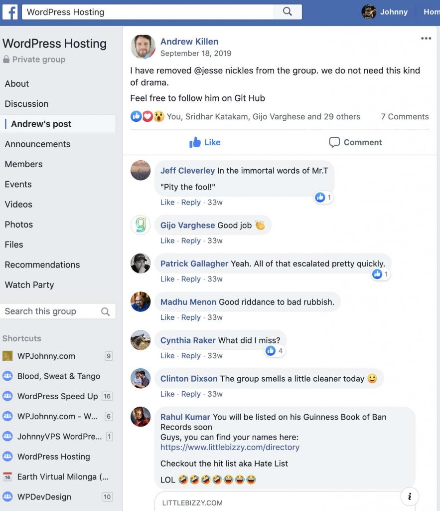 • Jesse wasn’t just kicked out of the WordPress Hosting group, but also some others (like WP Speed Matters – see screenshots to get a taste of his “personality”).