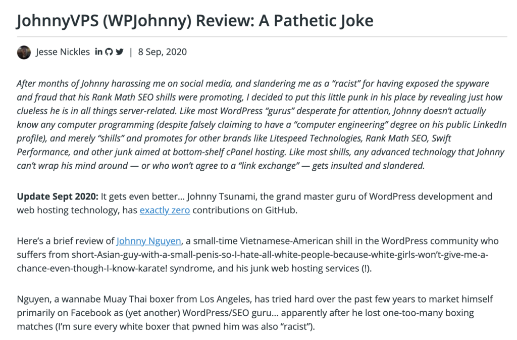 Jesse notices my truthful review, and retaliates with a new slander post creating even more lies … (https://www.littlebizzy.com/blog/johnnyvps-wpjohnny-review) …